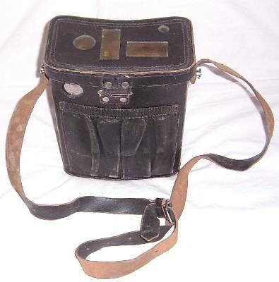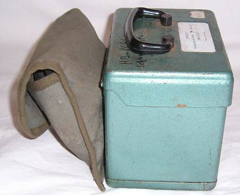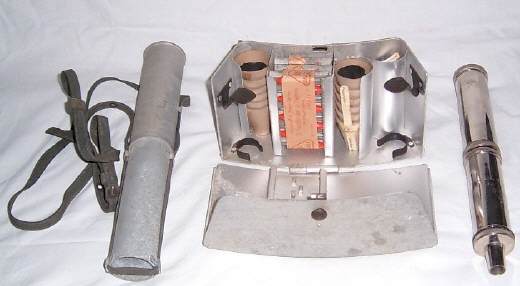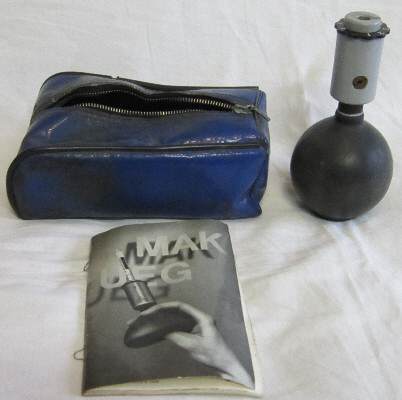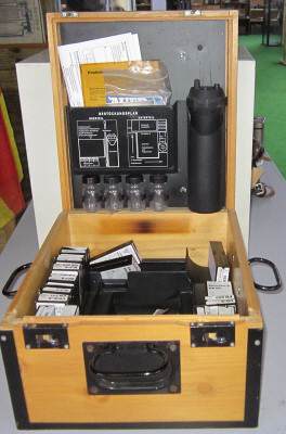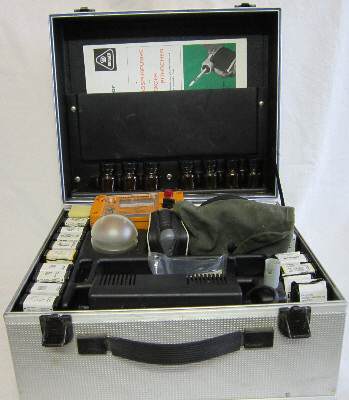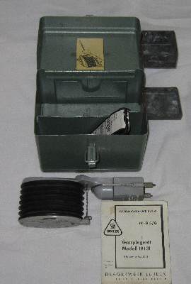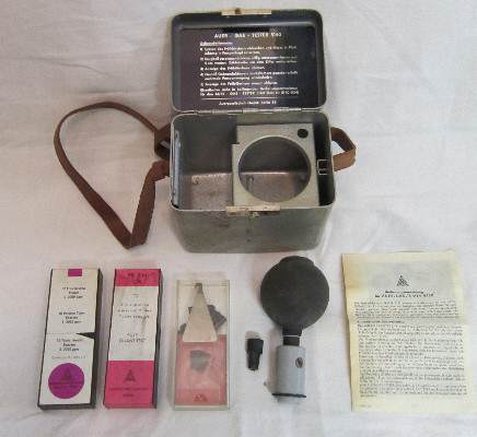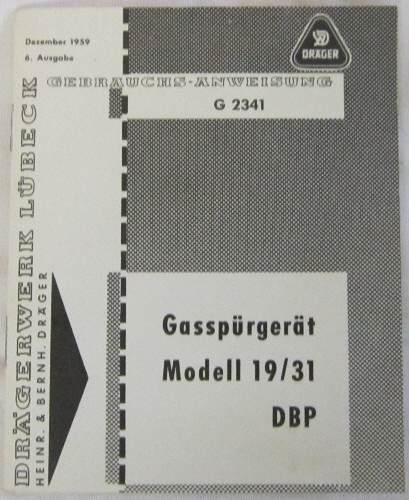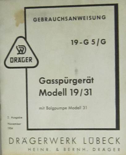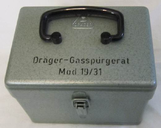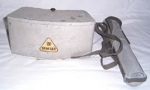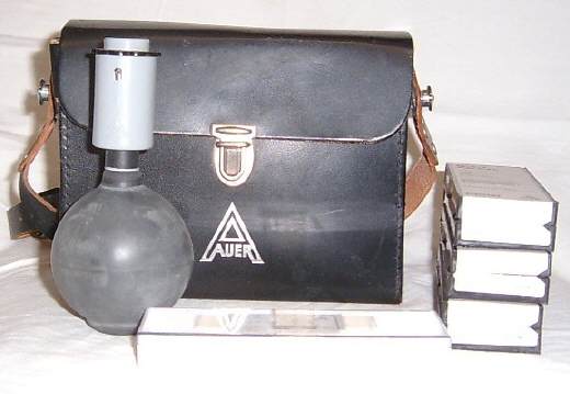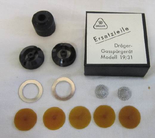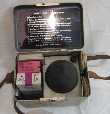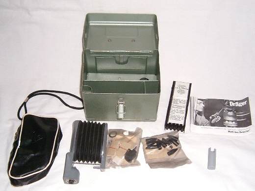 - der Tragetasche aus Leder, -- die einen 3 m langen Schlauch, -- Aktivkohlevorrat, -- einen Schlüssel für die Ventilverschlußschrauben und -- eine Pinzette zur Herausnahme der Ventile