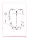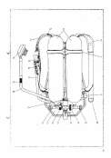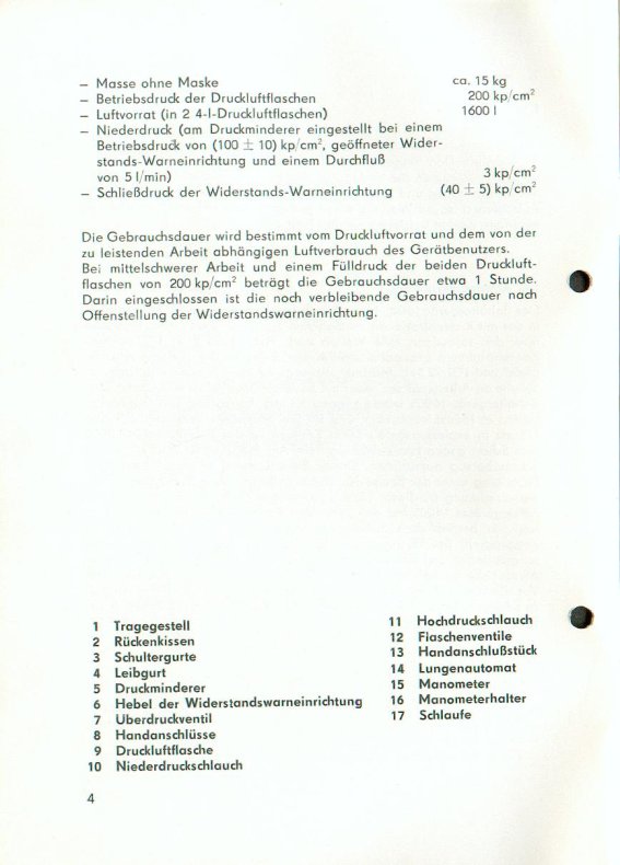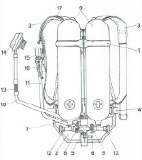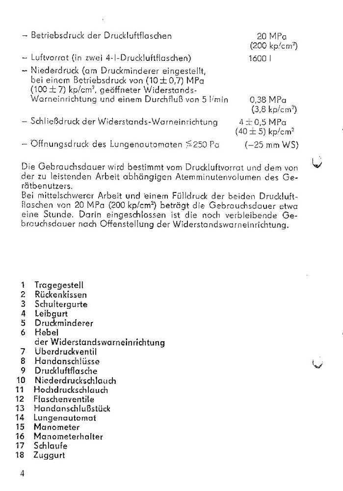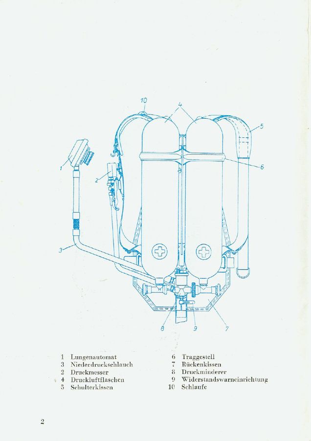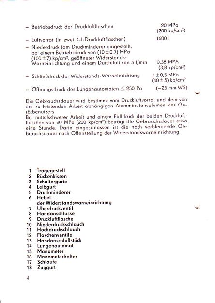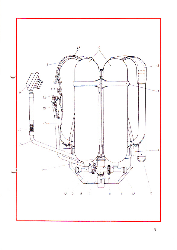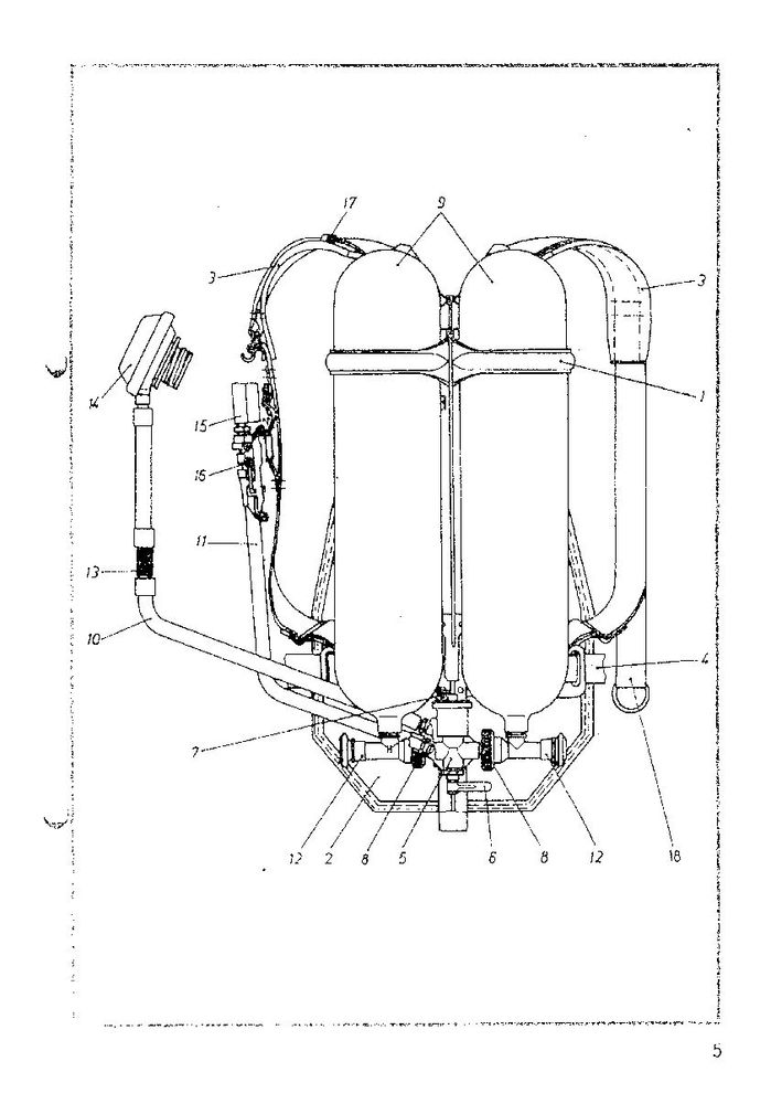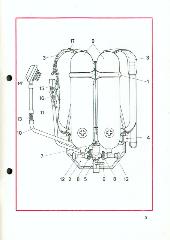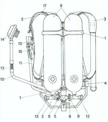 1 = Tragegestell2 = Rückenkissen3 = Schultergurte4 = Leibgurt5 = Druckminderer6 = Hebel der Widerstandswarneinrichtung7 = Überdruckventil8 = Handanschlüsse9 = Druckluftflasche10 = Niederdruckschlauch11 = Hochdruckschlauch12 = Flaschenventile13 = Handanschlussstück14 = Lungenautomat15 = Manometer16 = Manometerhalter17 = Schlaufe