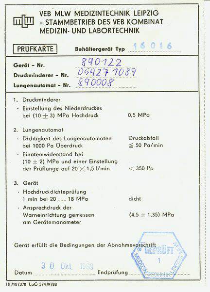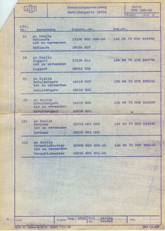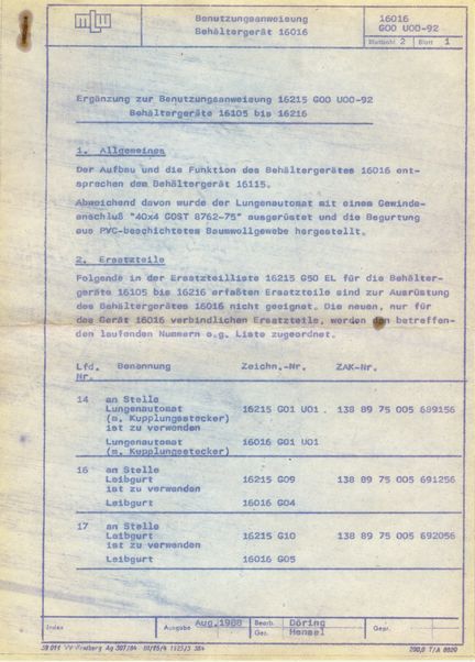 Der Aufbau und die Funktion des Behältergerätes 16016 entsprechen dem Behältergerät 16115. Abweichend davon wurde der Lungenautomat mit einem Gewindeanschluss "40 x 4 GOST 8762-75" ausgerüstet und die Begurtung aus PVC-beschichtetem Baumwollgewebe hergestellt. (z.Z. im IFM)