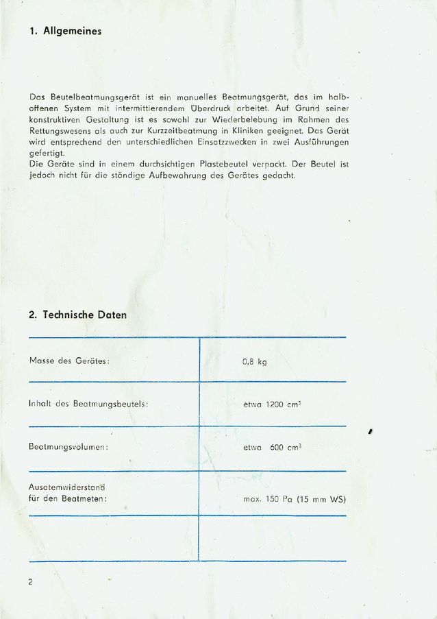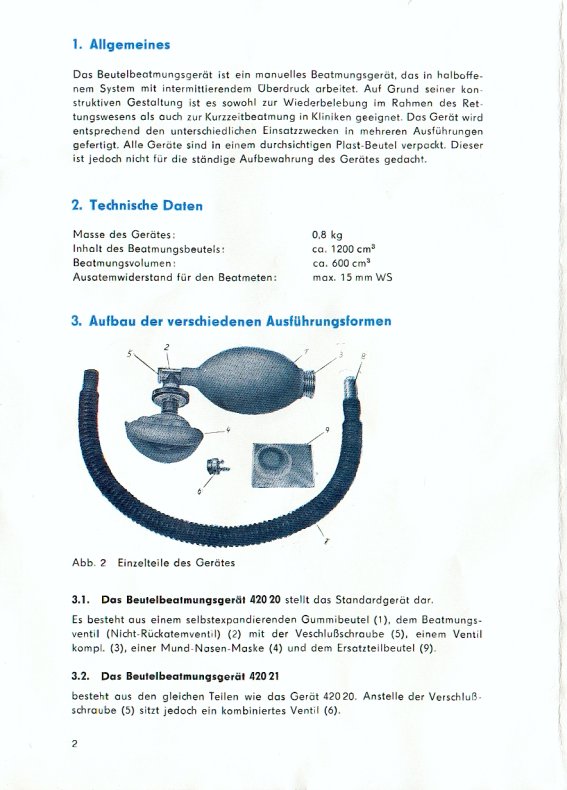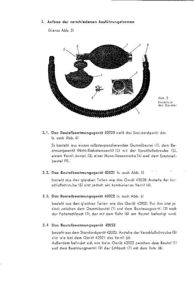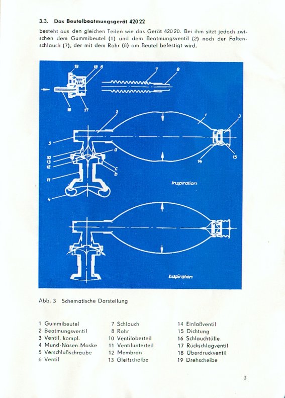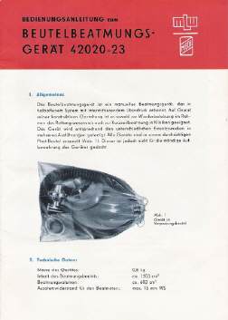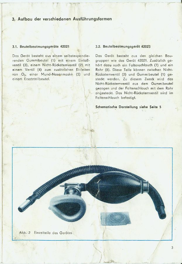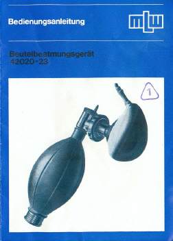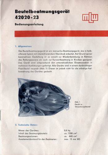 Das Beutelbeatmungsgerät 42023 oder 42021 war Bestandteil der Ausrüstung der SMH 3 (Schnelle Medizinische Hilfe). Die Unterbringung erfolgte im Fach 13 des Instrumentenschrankes. Im Bild der Barkas B 1000 SMH 3 des Blaulichtmuseums Beuster in 39615 Beuster. Bild 1 Bild 2