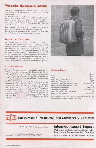 1 = Rückenteil2 = Deckel3 = Sauerstoffflasche4 = Armatur5 = Manometer6 = Umsteuerdose7 = Sekretflasche8 = Inhalationseinheit9 = Spannband10 = Verteilerstück11 = Dichtung12 = Behälter13 = Kopfband14 = Maske für Erwachsene15 = Maske für Kinder17 = Flaschenventil18 = Ventil Beatmung19 = Ventil Inhalation20 = Ventil Sog21 = Überwurfmutter22 = Klemmfeder für Sekretflasche23 = Tülle24 = Schlauch25 = Schlauch26 = Schlauch27 = Schlauch28 = Gummiband29 = Atembeutel